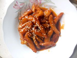 锅里放油热了之后放入番茄酱炒出红油,接着放入芡汁炒到冒泡泡,就赶紧倒入炸好的肉条,翻炒直至肉条都裹上了红汁就可以出锅了!撒点芝麻点缀更好!