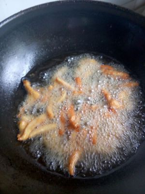 腌好的肉条放入淀粉挂糊汁中搅匀然后下锅炸,分批炸好之后,将炸好的肉条全部放入油锅复炸一遍,迅速捞出(熟了就可以捞出,不必等表面金黄,图中我炸到金黄做出来稍微有点老,有点硬)