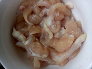 鸡胸肉根据纹路切小拇指宽的细条,放入碗中加盐加料酒腌制十分钟。