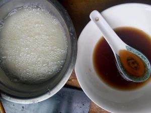 里脊炸好出锅沥干油,装碟。下面开始调蘸酱:三勺玉米淀粉调水待用,无油锅内加入一小碗清水、三勺糖、两勺酱油,水开后调入淀粉水勾芡,其间不断用勺子调匀酱,看调酱的勺子有厚厚的挂壁即可放入5大勺白醋,用勺子不停搅拌,看勺子挂壁情况适中即可关火装碗。酥脆酸甜的糖醋里脊大功告成!