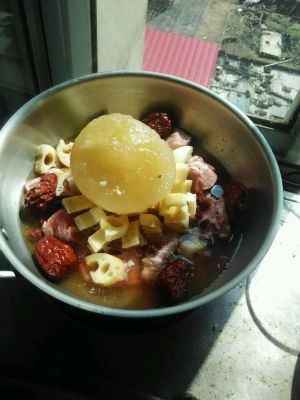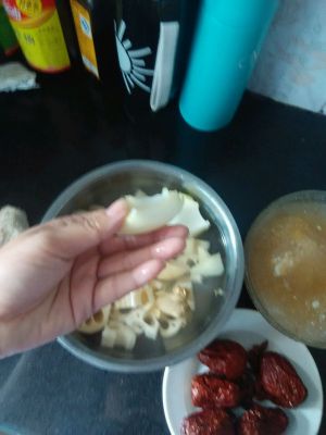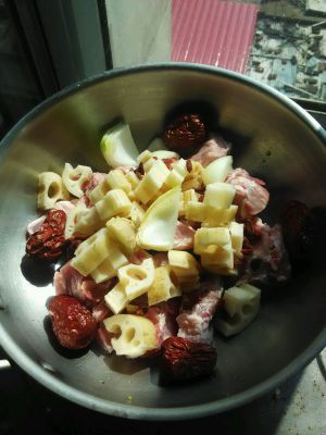 高汤解冻,大枣.枸杞备好,洋葱.姜及切好块的莲藕泡水以免氧化