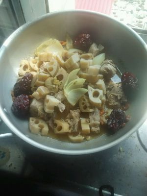 一次放排骨,藕,洋葱,姜,枣,枸杞入锅;再跟据个人口味放蚝油,酱油,酒,高汤等