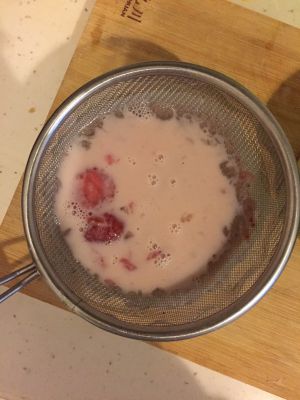 把倒好在两个小碗的蛋清牛奶混合液筛网滤一两遍