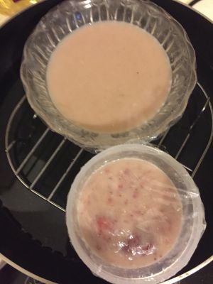 蒸好结皮的牛奶忘记拍照了,在边缘划一口子慢慢的把牛奶倒入事先蛋清白砂糖牛奶混合搅拌好的碗里,放锅里蒸10分钟再焖5分钟即可