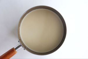 再加入淡奶油和牛奶,搅拌均匀。小火加热至细砂糖融化即可关火,无需煮开。