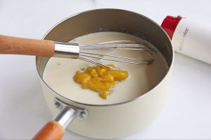 将芒果泥加入到温热的布丁液中,拌匀