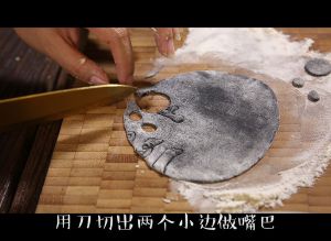 案板上涂抹适量面粉,加入竹炭粉的面团擀成片,用模子刻出两小一大三个圆,用刀切出两个小边做嘴巴,大圆对半切开做眉毛