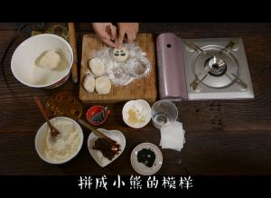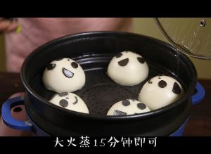 饧好的面团切成20g左右的一个面团,放入豆沙馅,把揉好的豆包整理成圆形,黑色面片粘水放到馒头上,拼成小熊模样