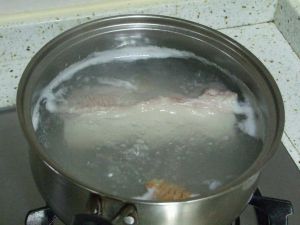 烧锅清水,水快开时加入大葱,姜片,料酒,以及五花肉。