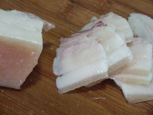 五花肉捞出之后,冷藏放十分钟之后,切成薄片,我的刀功很渣。
