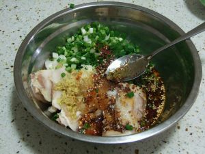 肉片装盘, 葱切花,姜切末,蒜切泥,与其余所有调料加入和匀。