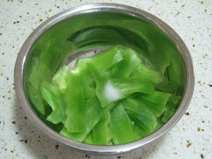 莴笋切片,撒入1g/半茶匙盐(不在菜谱用量内),和匀后腌40分钟。