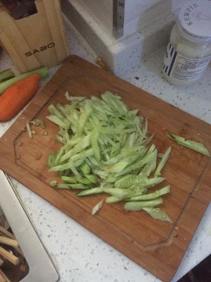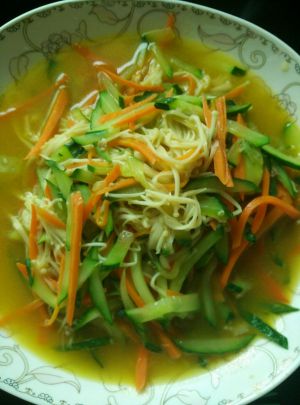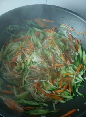 黄瓜丝要略粗一点。不然一炒就没了。我切的有些太粗了,大家可以忽略不看。哈哈。