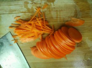 胡萝卜切斜片,再切丝,黄瓜同理