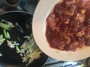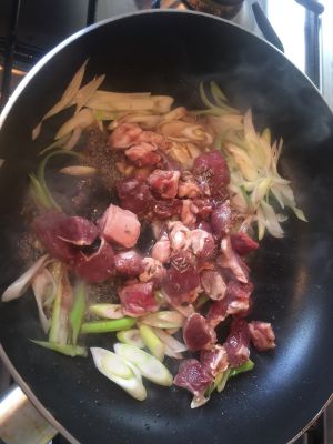 下小圆葱,盐,鸡精,十三香看个人口味加,我都是调料勺的半勺。生抽两勺。翻炒五分钟。
