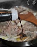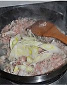 看到羊肉卷开始变软,有一部分开始变色,倒入大葱白片。