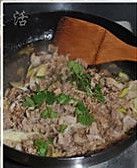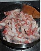 锅中放很少量的油,烧热后倒入羊肉卷爆炒。