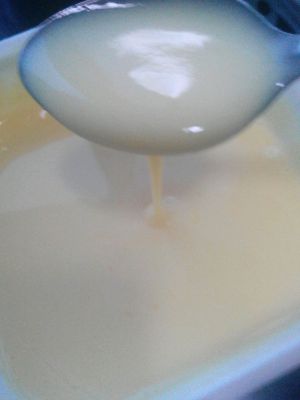 现将牛奶炼乳混在一起,搅拌均匀隔水加热,加热一会儿五六分钟就好