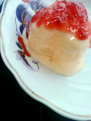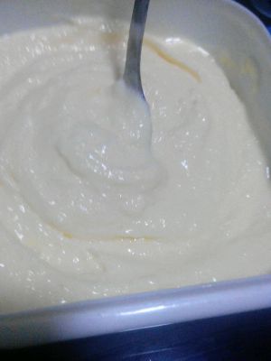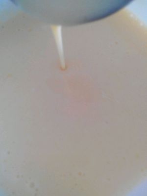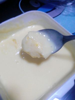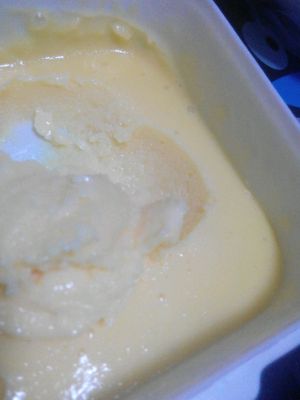 蛋液上锅,还是隔水加热,怕煮成蛋花粥所以隔水,然后把奶液加入蛋液中,加热至液体变浓稠便可以起锅了,放入事先备好的芒果泥儿。。OK放入冰箱。。期待中
