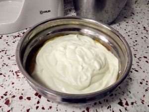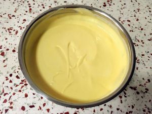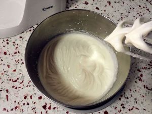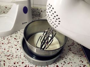 淡奶油加入糖粉,盆底坐一盆冰水,中速打发。
