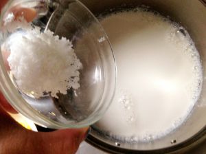 牛奶用小火加热约10分钟,加入砂糖搅拌,放凉