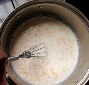把牛奶加热至冒泡,慢慢的倒进蛋黄液中,一定要注意,边倒边搅拌,否则就成了蛋花汤