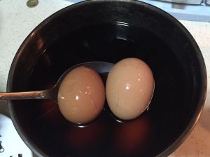 将鸡蛋拿出,用汤匙将蛋壳轻轻敲碎,至壳身大致都有破损为止(轻敲鸡蛋的目的在于这样烹煮时容易入味)