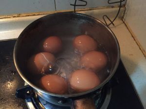 鸡蛋放锅中,倒入清水,以水刚漫过鸡蛋为较适宜。中火煮开,开后焖2分钟