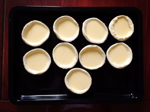 将蛋挞液倒入蛋挞皮中,8分满就好了,万一她在烤制过程中膨胀出来,你也没办法控制……留给她适当表现的空间吧!