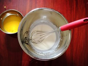 将蛋黄打散,其实也可以适当有一点蛋清在里面的。分2-3次加入牛奶和淡奶油的混合液里。