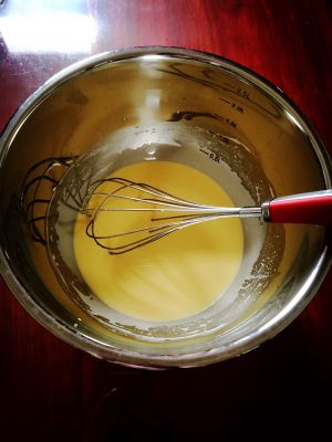 在上述液体中加入糖粉,充分搅拌至糖粉融化。如果你用的是砂糖,那就进行隔水加热,搅拌至砂糖融化,放置一侧降至室温。