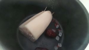 将红枣,花生,桂圆和枸杞洗净,加水煮汤,尽量将汤熬得浓些,多些。