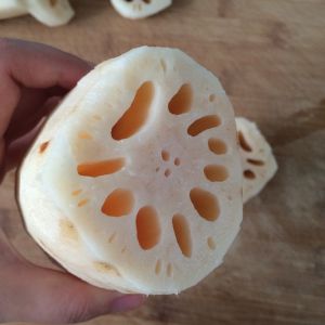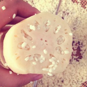 米灌好后,用刚切下的藕头封口,用牙签插住就可以。如果藕节过长被切开的话,可以在另外一节藕上侧切一片下来当藕盖。