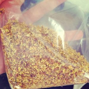 汤熬得差不多的时候配米。将白糯米和血糯捞出,加入干桂花拌匀。浸泡血糯的水留着,备用。