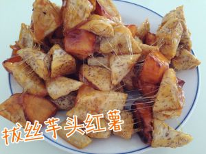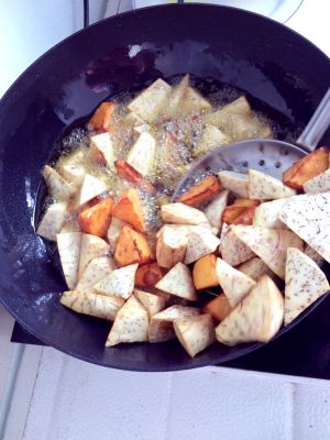 糖浆熬到变色后将芋头红薯一起放入锅中小火翻炒!
