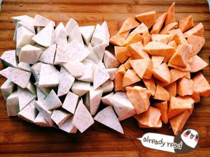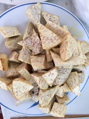 芋头切块,不要切方块,切成三角块,以免中间心不熟
