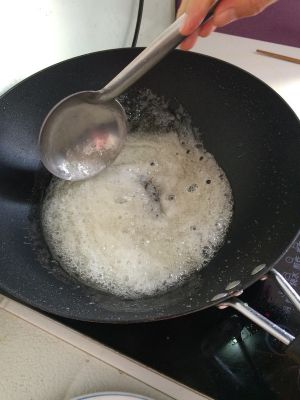 锅中稍微留一点油,放入糖,小火炒均匀加水,水开后,转小火一直熬