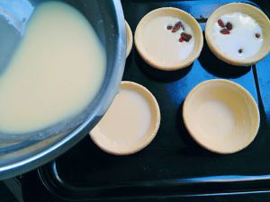 蛋挞液倒入已撒入葡萄干的蛋挞皮中,8分满即可。