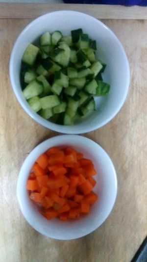 玉米剥粒(用小刀从根部剥离),胡萝卜切丁,黄瓜切丁,葱,姜切丝,松仁可买现成的;