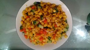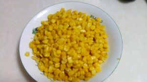 锅内加水,放少许盐,少许橄榄油,依次将胡萝卜,玉米粒焯熟。