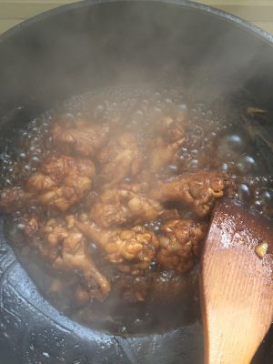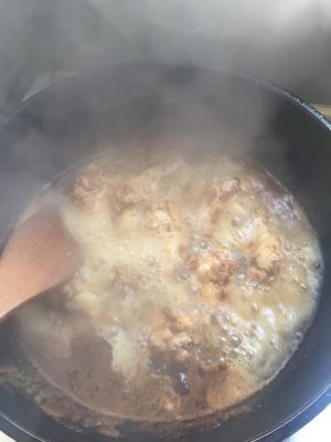 倒入可乐,没过鸡腿,然后倒入料酒,少许盐,开始炖