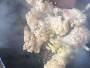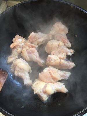 锅内放少许油,待油热后放入控干水的鸡腿翻炒至微黄。