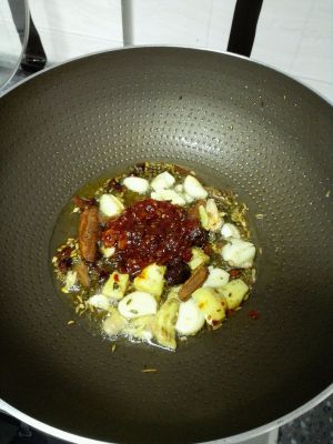 姜蒜拍散连同香料下锅,加入两勺郫县豆瓣炒香。