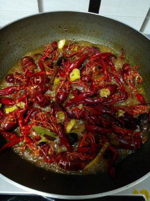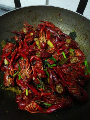 剥好葱姜蒜,下油锅加花椒炒香,下小龙虾!然后,你就咕嘟咕嘟让它煮二十分钟!