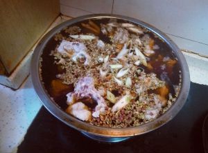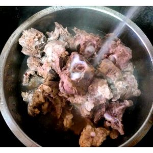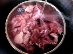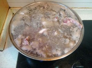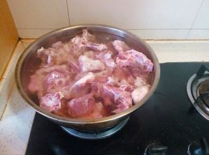 羊蝎子泡进清水里,去除血水,反复换水,至少一个小时。