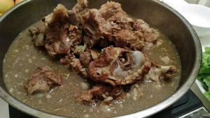 将羊蝎子捞出放在盆中,锅内的水倒掉不要。