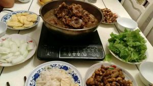 羊蝎子炖熟后,准备土豆、莴笋、白菜、豆腐、蘑菇等等,全家人围坐在一起就可以吃羊蝎子火锅啦。