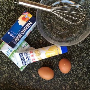 奶油+牛奶+糖+鸡蛋,搅拌均匀