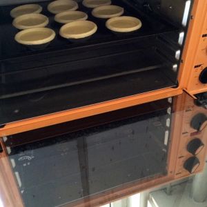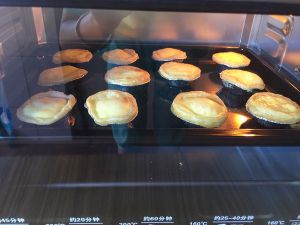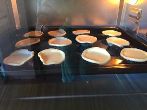 第四步:初定烘焙时间为30分钟,由于烤箱品牌型号五花八门,烘焙时间也不尽相同,当我们看到烤箱内大多数蛋挞有葡式蛋挞那种轻微焦糊的表面的时候,就可以关闭烤箱了。30分钟还不行的话就继续加时间。