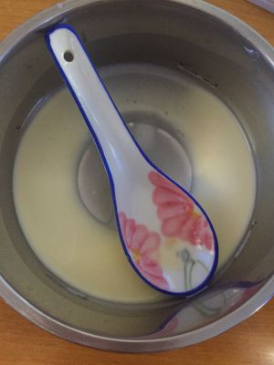 第二步:先把购买的材料(除蛋黄外)按比例混合均匀,感觉白糖混合化开后,加入蛋黄搅拌均匀,调制好的汁倒入蛋挞皮(别倒的太满,蛋挞皮内容积的十分之二到十分之九)。